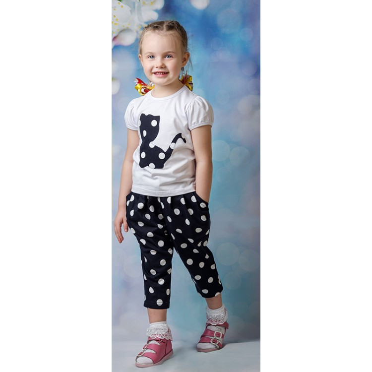 - футболка с короткими рукавами, на лицевой стороне иллюстрация кошки. Основной цвет - белый; кошка в горошек, в тон к бриджам;