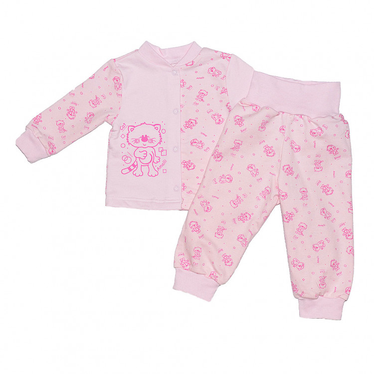 - штаны розового цвета с рисунками. Талия и низ ножек имеют широкую трикотажную резинку.