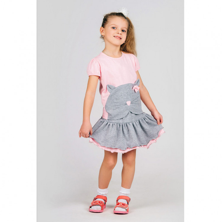 - футболка с короткими рукавами; нижняя часть изделия имеет фигурную нашивку в виде котика с бантиком;